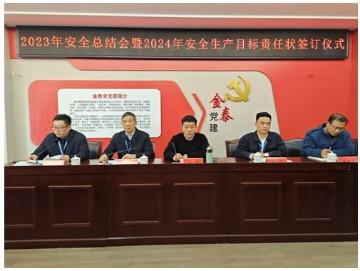最后,董事长对2023年安全生产工作进行总结点评。董事长指出,2024年是我国全面开展“安全生产治本攻坚三年行动”的开局之年,也是公司迎接2026年“二十周年”庆典的启动之年。金泰公司要依据现状,制定符合公司实际的“安全生产治本攻坚三年行动方案”,切实提升公司安全环保管理水平,用全新的安全环保管理面貌迎接公司2026年庆典。董事长强调,2024年将是金泰奋进提升的一年,随着滨江工业园区重大项目的新建,我们的供热量将大幅增长,这对公司来说是发展机遇,更是挑战和考验。我们要全面提升本质安全水平的导向,更加注重打基础、补短板、填弱项。更加注重防范化解重大风险隐患。更加注重深化应急管理和应急能力建设,突出“五个必须、五个坚决”:
